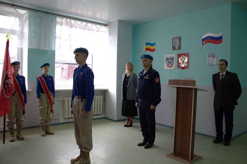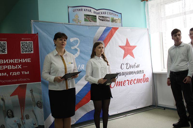 На торжественном мероприятии присутствовали почетные гости – начальник штаба Тацинского местного отделения «ЮНАРМИЯ» Владимир Воловликов, директор Информационно-методического центра Тацинского района Елена Попова, методист Информационно-методического центра Тацинского района Ксения Токарева, юнармейцы, обучающиеся и педагоги.